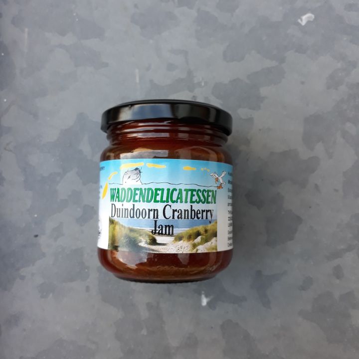 Ingediënten: suiker, duindoorn (24%), cranberry (10%), water, geleermiddel (pectine), citroensap.